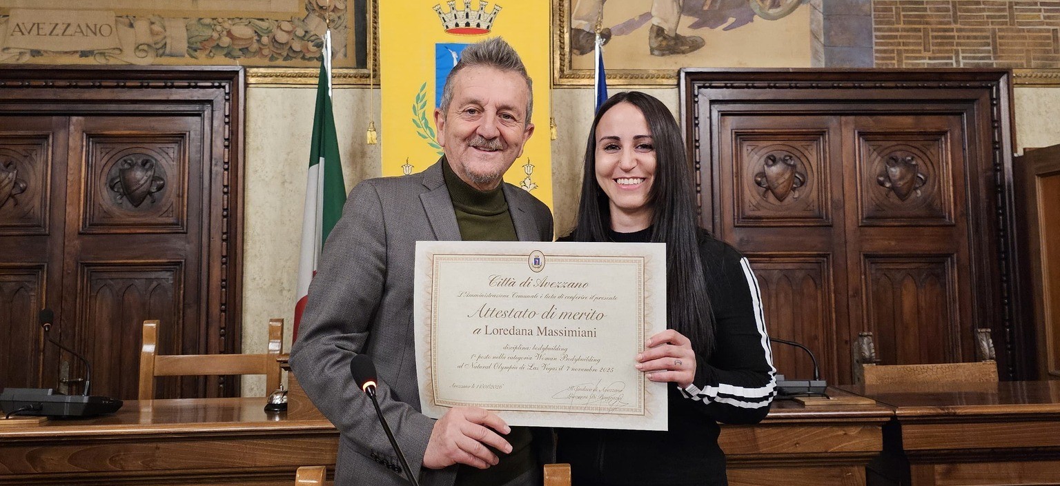 Mercoledì pomeriggio, nella sala Consiliare del Municipio, si è svolta la cerimonia di premiazione dell’atleta Loredana Massimiani che ha conquistato il⁠ ⁠1° posto nella categoria Woman Bodybuilding al Natural Olympia di Las Vegas lo scorso 7 novembre 2025. Un’ambasciatrice internazionale dello sport dalla Marsica agli Usa, Loredana, già biologa e nutrizionista, ha ottenuto anche il riconoscimento di atleta professionista in due categorie ed ha trionfato in diverse gare europee, come quella di Lisbona sempre nel 2025. Ieri quindi, un’emozionante cerimonia di consegna dell’attestato di Benemerenza per i risultati conseguiti alla quale hanno partecipato il Sindaco Gianni Di Pangrazio, l’assessore allo Sport, Pierluigi Di Stefano, il consigliere Ignazio Iucci, i familiari e gli amici di Loredana e Lorenzo De Cesare, già assessore del Comune di Avezzano e proprietario della FiveZone, centro sportivo dove si allena la bodybuilder avezzanese.