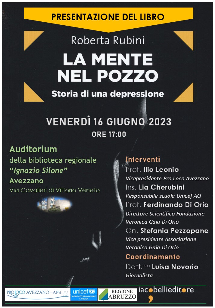 “L’Organizzazione Mondiale della Sanità dichiara che nel 2020 la depressione sarà la più diffusa al mondo tra le malattie mentali e in generale la seconda malattia più diffusa dopo le patologie cardiovascolari.” L’appuntamento con l’autrice è venerdì 16 giugno 2023 ore 17 presso l’Auditorium della biblioteca regionale “Ignazio Silone” – Via Cavalieri di Vittorio Veneto in Avezzano. L’evento vede il patrocinio della Regione Abruzzo e del Comitato Prov.le Unicef L’Aquila.