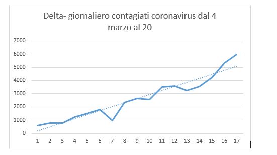 Abbiamo poi preso i dati giornalieri (dal 4 al 20 marzo), ne abbiamo calcolato il delta, ossia la variazione dei casi di un giorno rispetto al precedente e li abbiamo messi in grafica qui sotto.