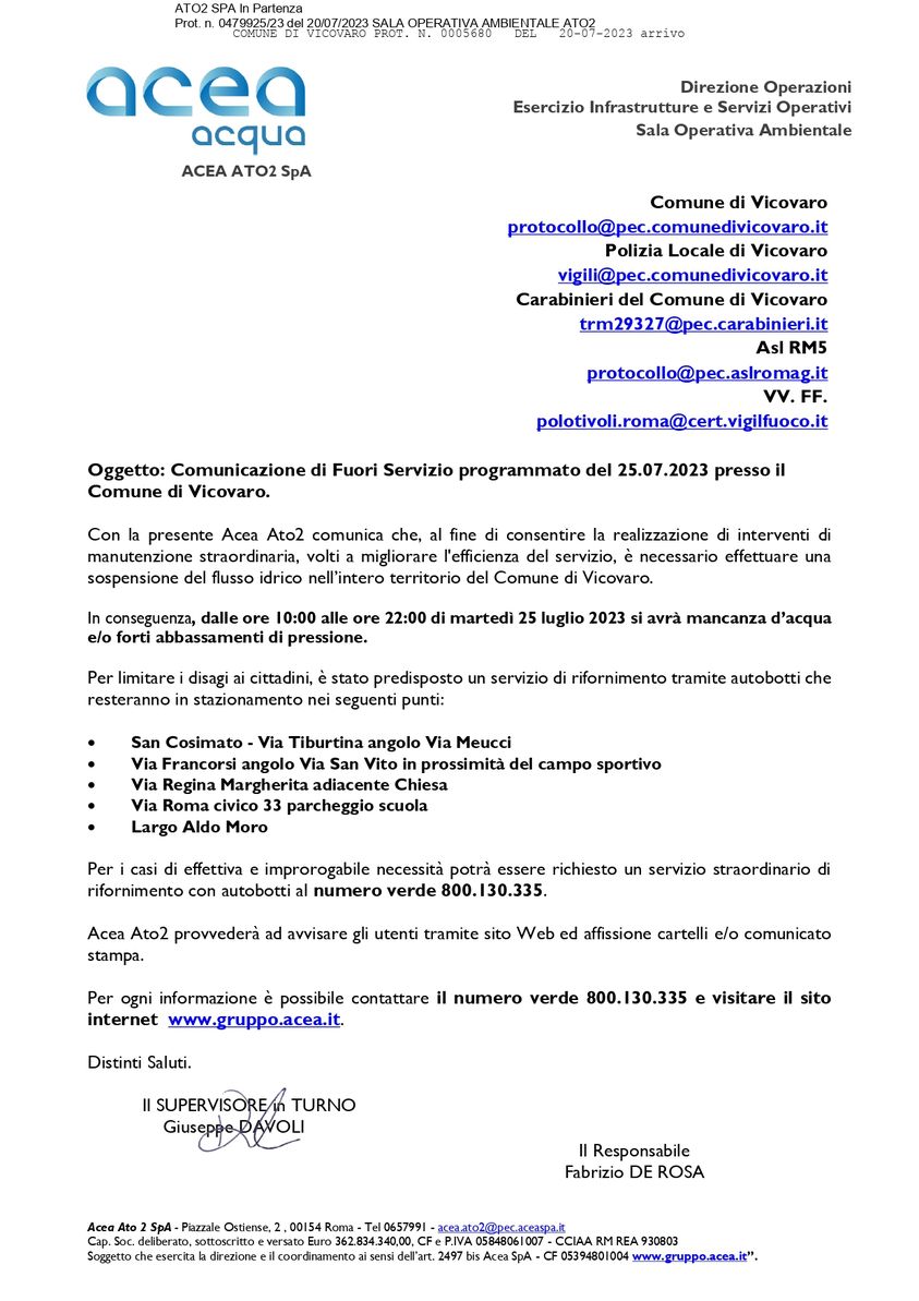 VICOVARO – Oggi Martedì 25 luglio 2023, sulla base di una comunicazione ufficiale dell’ACEA, allo scopo di consentire alcuni necessari interventi di manutenzione straordinaria alla rete, che potrebbero risolvere alcune criticità segnalate da tempo, è prevista una temporanea sospensione del servizio.