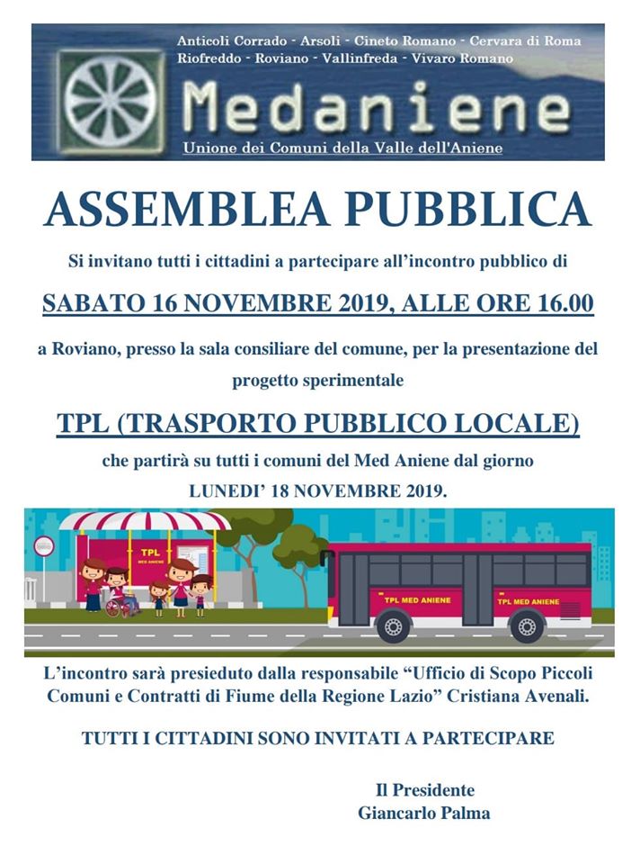Valle Aniene – Si concluderà domani sabato 16 novembre alle ore 16.00 a Roviano il ciclo di presentazioni per tutti i cittadini del quadrante Med Aniene, del prossimo servizio TPL (trasporto pubblico locale) a carattere sperimentale, che prenderà il via lunedì 18 novembre 2019 nei comuni aderenti: Anticoli Corrado, Arsoli, Cineto Romano, Cervara di Roma, Riofreddo, Roviano, Vallinfreda e Vivaro Romano