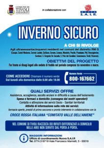 Vicovaro – Interessante iniziativa intrapresa nel Comune di Vicovaro, come negli altri sedici comuni del Distretto Sanitario di Tivoli, grazie al PROGETTO INVERNO SICURO. E? stato istituito infatti un NUMERO VERDE 800167662, presso il quale i cittadini over 65 anni possono chiedere di essere assistiti gratuitamente nelle seguenti attività per fronteggiare al meglio le problematiche dovute al freddo: