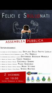 Arsoli – L’appuntamento è per sabato 2 dicembre prossimo alle ore 10 presso il teatro Comunale di Arsoli con l’evento sul tema: “Felici e sbullonati”. Si tratta di un approfodimento organizzato in collaborazione dall’Istituto Omnicompresivo di Arsoli e i comuni di Arsoli, Roviano, Riofreddo, Anticoli Corrado e Vivaro Romano, specificamente sul tema del bullismo nelle scuole e nella vita. Sono previsti interventi della Preside dell’Istituto dott.ssa Lucilla delle Fratte, della vice dott.ssa Ornella Pili, e della responsabile del centro di ascolto Manuela Boccolini e i sindaci dei comuni interessati.