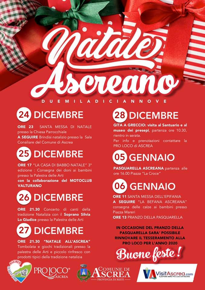 Ascrea – Arriva il Natale ed il programma ascreano quest’anno è ricco di eventi ed occasioni per stare insieme e condividere bei momenti come avviene in una grande famiglia – La Pro Loco ha reso noto il calendario degli eventi che di seguito pubblichiamo!
