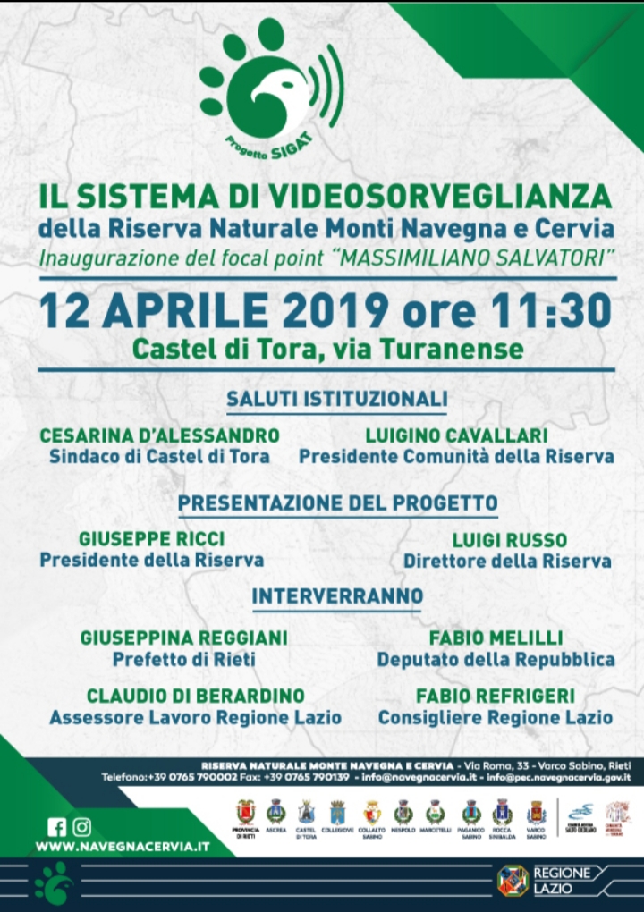 All’incontro di venerdì 12 aprile faranno gli onori di casa il Sindaco di Castel di Tora, Cesarina D’Alessandro, il Presidente della Comunità della Riserva, Luigino Cavallari ed il Presidente della Riserva, Giuseppe Ricci. A seguire il Direttore della Riserva, Luigi Russo, esporrà il funzionamento di un sistema formato da 32 telecamere dislocate sul territorio monitorate presso il Focal Point di Castel di Tora che, nella mattinata del 12 aprile, verrà inaugurato alla presenza del Prefetto di Rieti Giuseppina Reggiani, di tutte le forze dell’ordine che hanno contribuito all’approvazione del progetto, del Deputato, On. Fabio Melilli, dell’Assessore al Lavoro della Regione Lazio Claudio di Berardino e del Consigliere regionale Fabio Refrigeri.