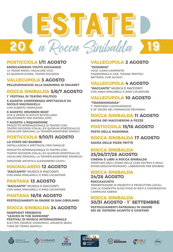 Redazione – L’Estate 2019 Rocca Sinibalda anche per quest’anno vede appuntamenti per grandi e piccini e per i visitatori che potranno scoprire le bellezze di un luogo dove per un mese intero, si fonderanno cultura, musica, storia e tradizioni con un programma “costruito” da Comune, dal direttore artistico Alessandro Cavoli e dall’Associazione culturale Macondo guardando ai gusti e agli interessi di ognuno riuscendo ad unire tutte le arti in un progetto, partito lo scorso Natale con “Il paese che non c’era” che guardi al futuro e ad una valorizzazione e crescita culturale del territorio partendo dallo “Stato dei bambini” che sta crescendo a Posticciola dove sono arrivati artisti da diverse nazioni europee entrando a contatto con il paese e i suoi abitanti.