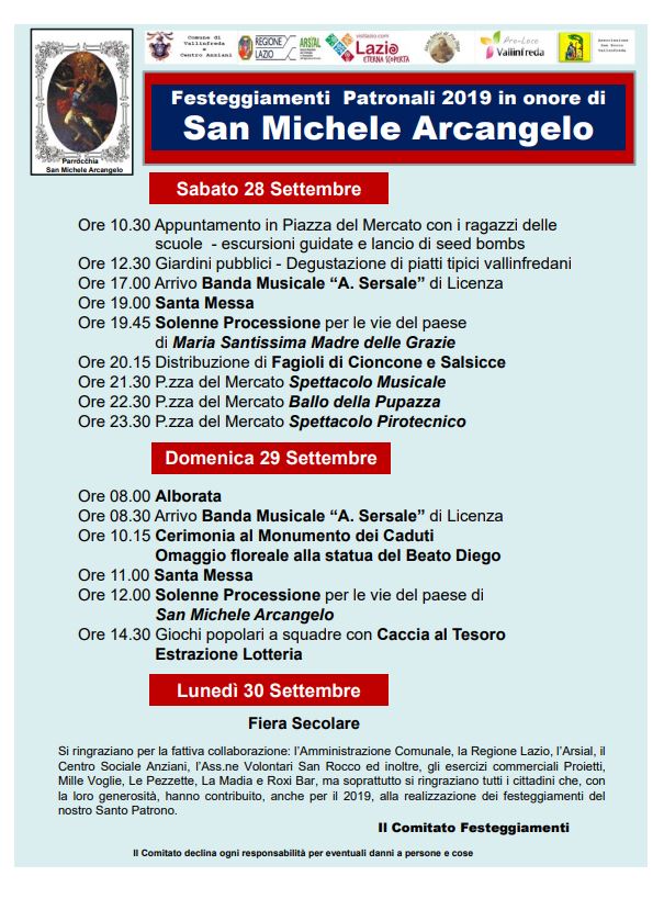 Vallinfreda – C’è attesa per sabato 28 settembre 2019 quando prenderanno il via i festeggiamenti in onore di San Michele Arcangelo patrono di Vallinfreda. Una tregiorni che vedranno protagonista il bellissimo e suggestivo borgo tinto a festa. Un programma ricco pieno di eventi tutti da vivere insieme organizzati dal comitato in collaborazione con la Proloco di Vallinfreda, il Comune, il centro anziani, la Fondazione Fra Diego Oddi e con il patrocinio della Regione Lazio.