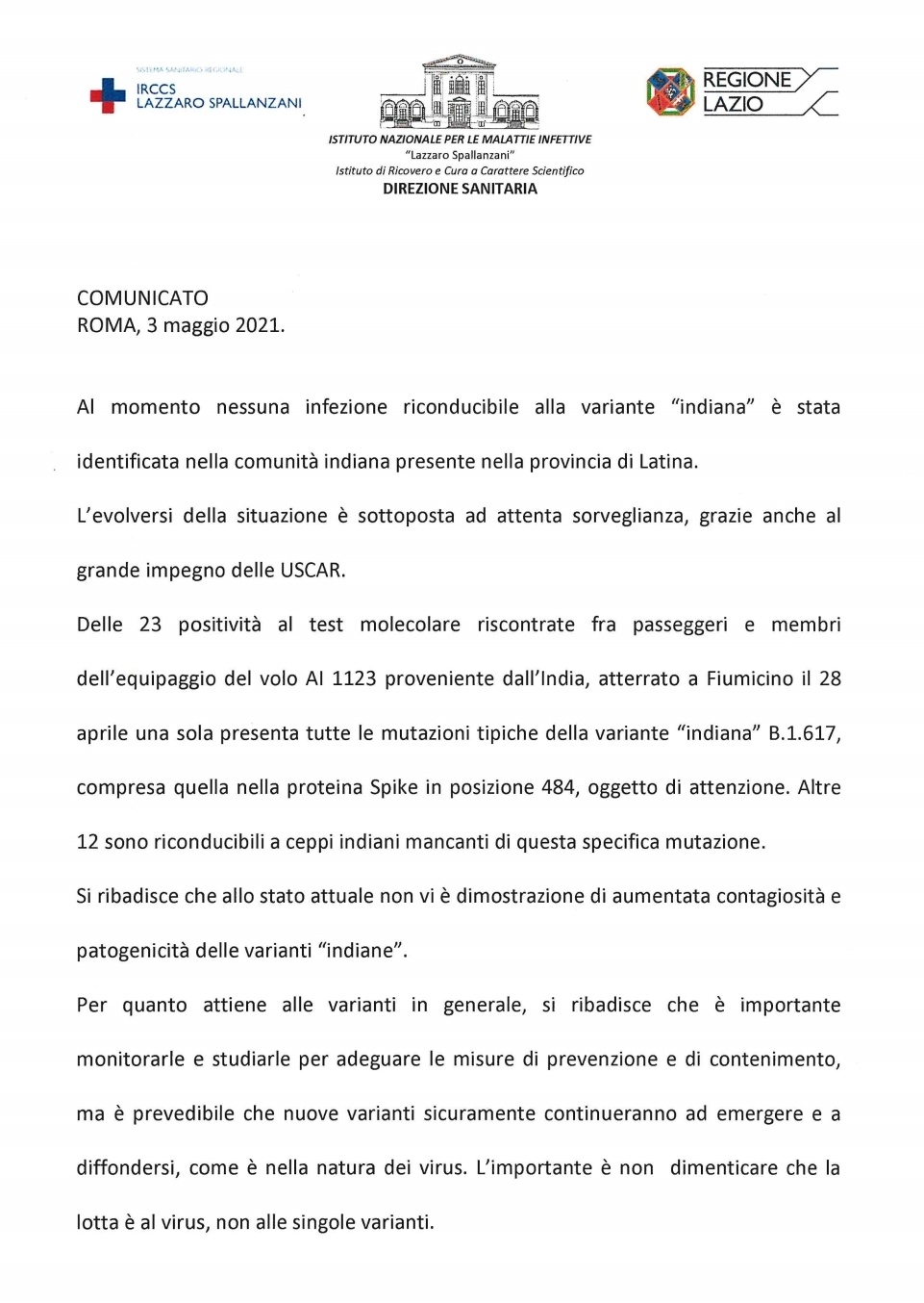 Roma – E’ stato diramato un urgente comunicato stampa dall’Inmi Lazzaro Spallanzani di Roma sul tema della “variante indiana”. L’istituto precisa, che nessuna infezione è riconducibile a tale variante nella comunità indiana presente nella provincia di Latina, ed inoltre non vi è alcuna dimostrazione di aumentata contagiosità e patogenicità della varianti indiane. Con buona pace di chi con ogni “variante” approfitta per terrorizzare il popolo. Ecco il comunicato ufficiale che ci è stato trasmesso in redazione: