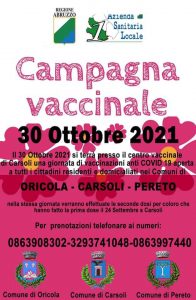 Carsoli  – Il prossimo 30 ottobre al via la Campagna vaccinale per tutti i cittadini residenti o domiciliati nei Comuni di Carsoli, Oricola e Pereto. Le inoculazioni anti Covid 19 presso il centro vaccinale di Carsoli allestito nel salone di Via Genova (piano superiore edificio scuola materna). Per prenotarsi si possono  contattare i numeri: 0863/908302, 329/3741048, 0863/997740.