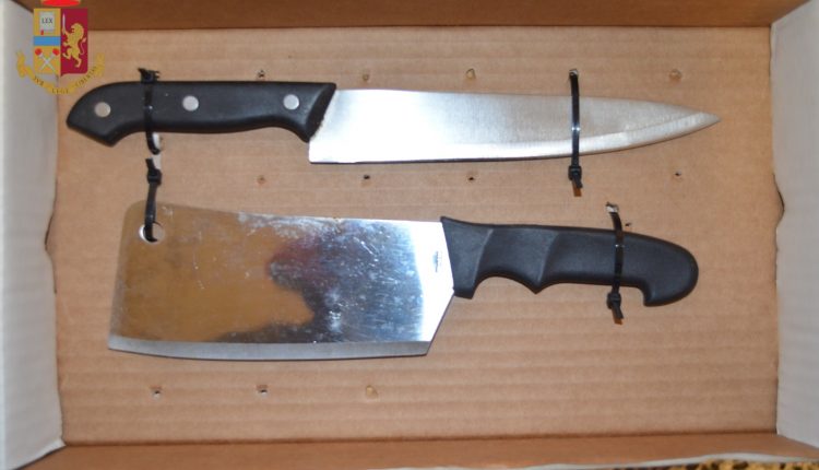 Quando i poliziotti gli hanno chiesto di mostrargli cosa avesse sotto il sedile, lui ha estratto un coltello con manico lungo 13 cm e lama 20 cm ed una mannaia con il manico della stessa lunghezza di quello del coltello e lama di 17 cm.