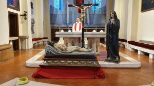 Una diretta simbolica che parte da Carsoli ove è stata ripresa ma che rappresenta l’Universalità della Chiesa Cattolica. Al termine dei sette dolori recitati in alternanza da don Roberto Cristofaro e da una delegazione molto ristretta del Coro Parrocchiale, il sacerdote ha lanciato un messaggio di speranza verso questa Pasqua da trascorrere in casa. Poi bacio virtuale per il Cristo Morto Maria Santissima addolorata composti presso l’altare. Non si è potuta svolgere nemmeno una processione simbolica a causa degli specifici divieti significati dalle varie Diocesi.
