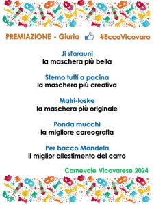 I vincitori del Carnevale Vicovarese 2024 sono: “Ji sfarauni” come maschera più bella; “Stemo tutti a pacina” come maschera più creativa; “Matri-loske” come maschera più originale; “Ponda mucchi” per la migliore coreografia; “Per bacco Mandela” per il miglior allestimento del carro.