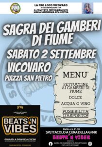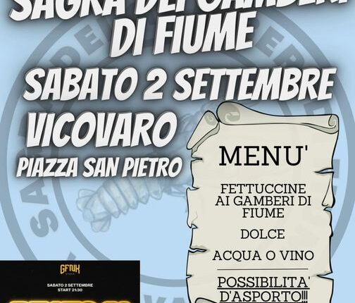 Vicovaro – Dopo il successo della scorsa edizione la Pro Loco di Vicovaro, in collaborazione con il Comitato Festeggiamenti Maria SS Avvocata Nostra presenta “La sagra dei gamberi di fiume”.