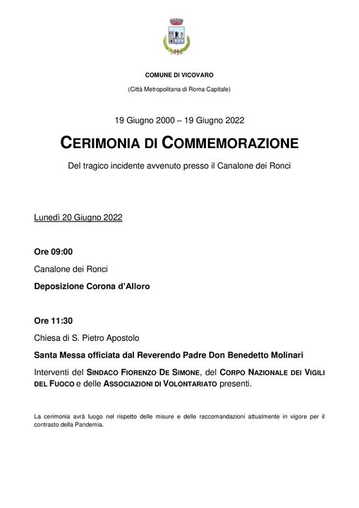 Vicovaro -E’ stata organizzata a Vicovaro una commossa cerimonia in ricordo delle vittime dell’Incidente del Canalone dei Ronci. Il sindaco Fiorenzo De Simone ricorderà dunque  con commozione quel tragico evento che 22 anni fa ebbe a turbare tutta la valle dell’Aniene. Si ricorderà che il 19 giugno 2000 avvenne la tragedia che coinvolse il Drago 56, l’elicottero dei Vigili del Fuoco che ebbe a precipitare tra Vicovaro e Roccagiovine.