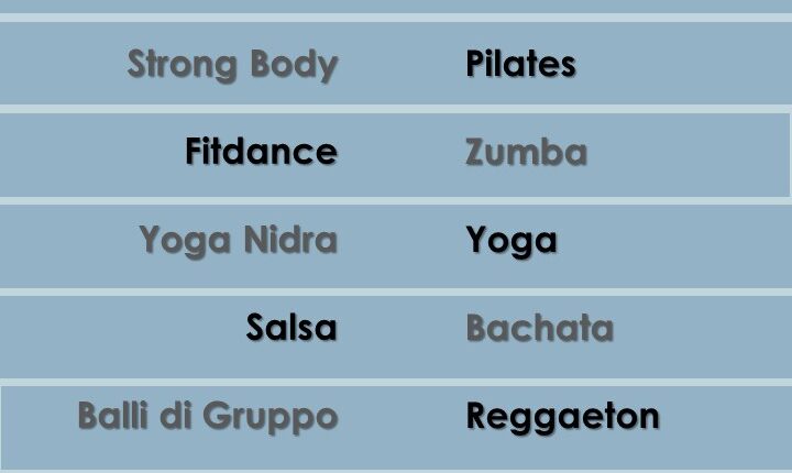 Con Sara Duvalli: Danza Moderna, Danza Classica, Strong Body, Pilates e Fitdance. Con Lucia Perozzi: Yoga Nidra. Con Fabio Bartolini & Sheila Iannotti: Salsa e Bachata. Con Antonio Tarquini: Yoga. Con Anna Baciotti: Zumba, Balli di gruppo e Reggaeton.