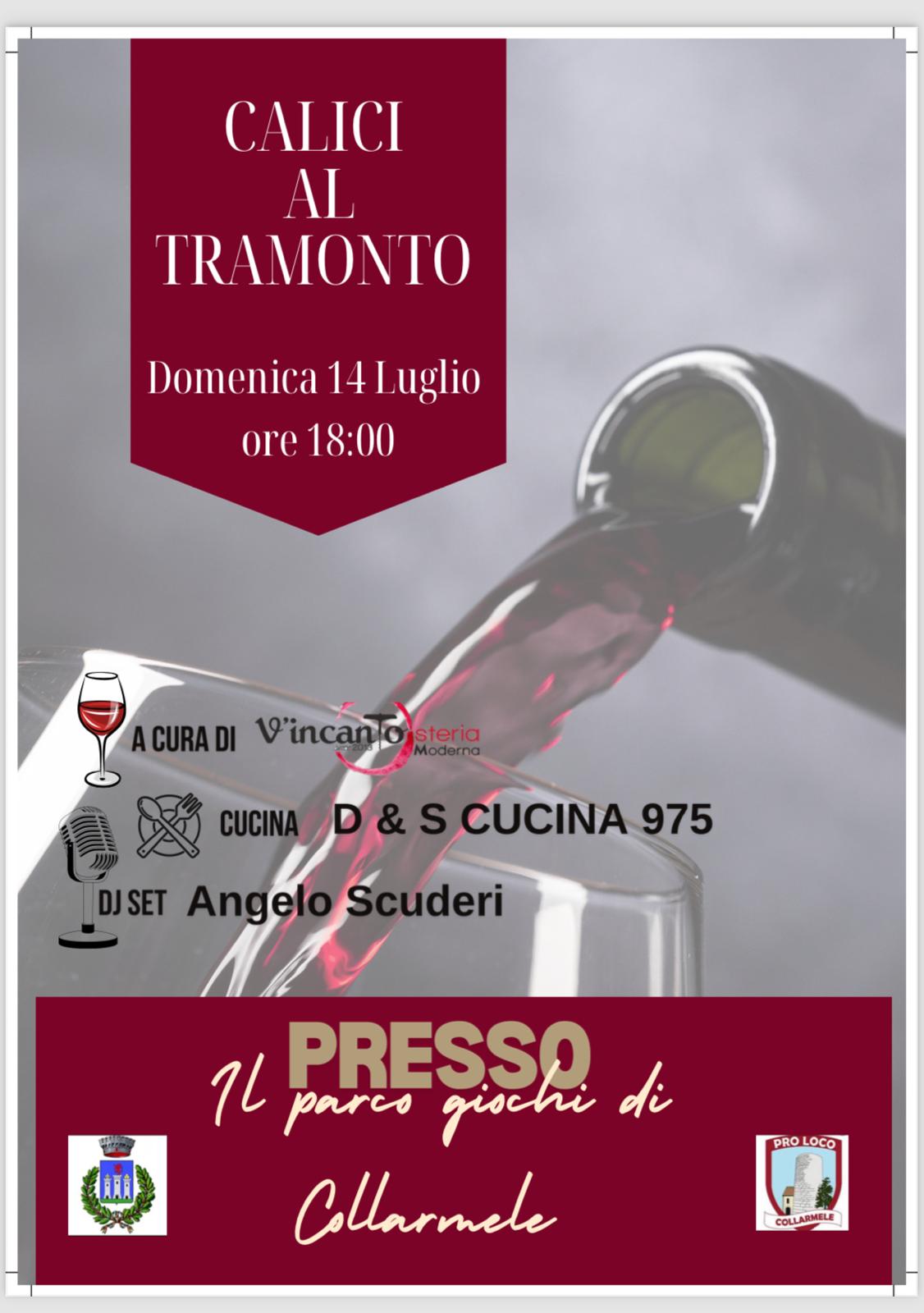 COLLARMELE – Il format “Calici al Tramonto” coniato da V’Incanto Osteria Moderna di Carsoli approda a Collarmele. Nel suggestivo parco del bel borgo della Marsica, convivialità e buon gusto domenica 14 luglio 2024: Musica in live, divertimento al fresco e con le squisitezze di V’Incanto: di seguito il dettaglio evento: