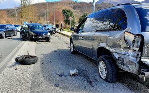 Carsoli – Un incidente si è verificato poco fa sulla Tiburtina Valeria proprio alle porte di Carsoli, nei pressi del Cimitero. Stando ad una prima ricostruzione dei fatti, una Citroen ha tamponato violentemente un Suv il quale dopo aver messo la freccia si era accostato per far salire un ragazzo che si trovava sul marciapiede adibito a passeggiate. L’impatto è stato particolarmente violento tanto che la utilitaria si è rigirata su se stessa perdendo una ruota che è volata lungo la sede stradale. Fortunatamente non sono state coinvolte altre auto. I due conducenti dei veicoli sono stati trasportati per controlli presso l’Ospedale di Avezzano, ma nessuno dei due conducenti ha riportato ferite gravi.