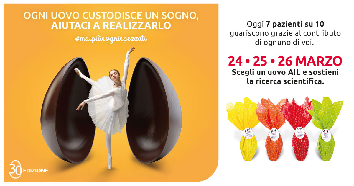 Per raggiunere nuovi obiettivi nella lotta a leucemie, linfomi e mieloma, abbiamo bisogno del tuo aiuto. Il 24, 25 e 26 marzo scegli un Uovo di Pasqua AIL. Con una donazione minima di 12 euro potrai permettere alla Ricerca di non fermare la sua crescita e a tante persone di poter guardare con fiducia al futuro. Dal 21 marzo, cerca online la piazza più vicina a te su ail.it e fai qualcosa di piccolo ma concreto contro chi sta combattendo la battaglia più grande, quella per la vita.