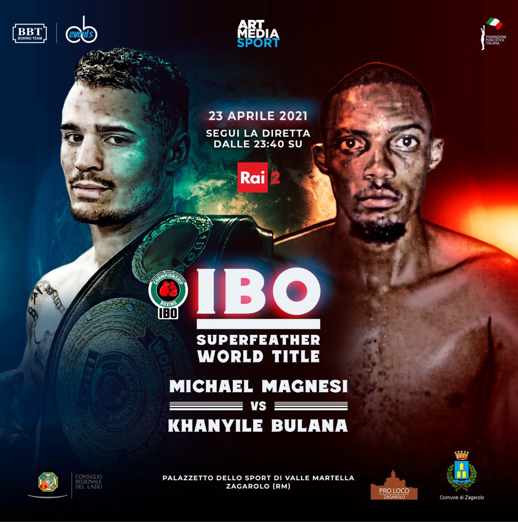 La competizione si terrà nel Palazzetto di Valle Martella, in diretta su Rai Sport dalle ore 20:40 e su Rai2 dalle 23:40. Khanyile Bulana sfiderà il campione in carica italiano Michael Magnesi