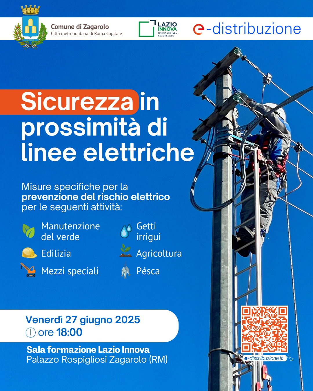 Zagarolo – Enel Distribuzione, in collaborazione con il Comune di Zagarolo e Lazio Innova, presenta nella Sala Formazione dello Spazio Attivo LOIC di Zagarolo un incontro aperto a tutti al fine di sensibilizzare le categorie più a rischio sul tema della sicurezza delle linee elettriche.